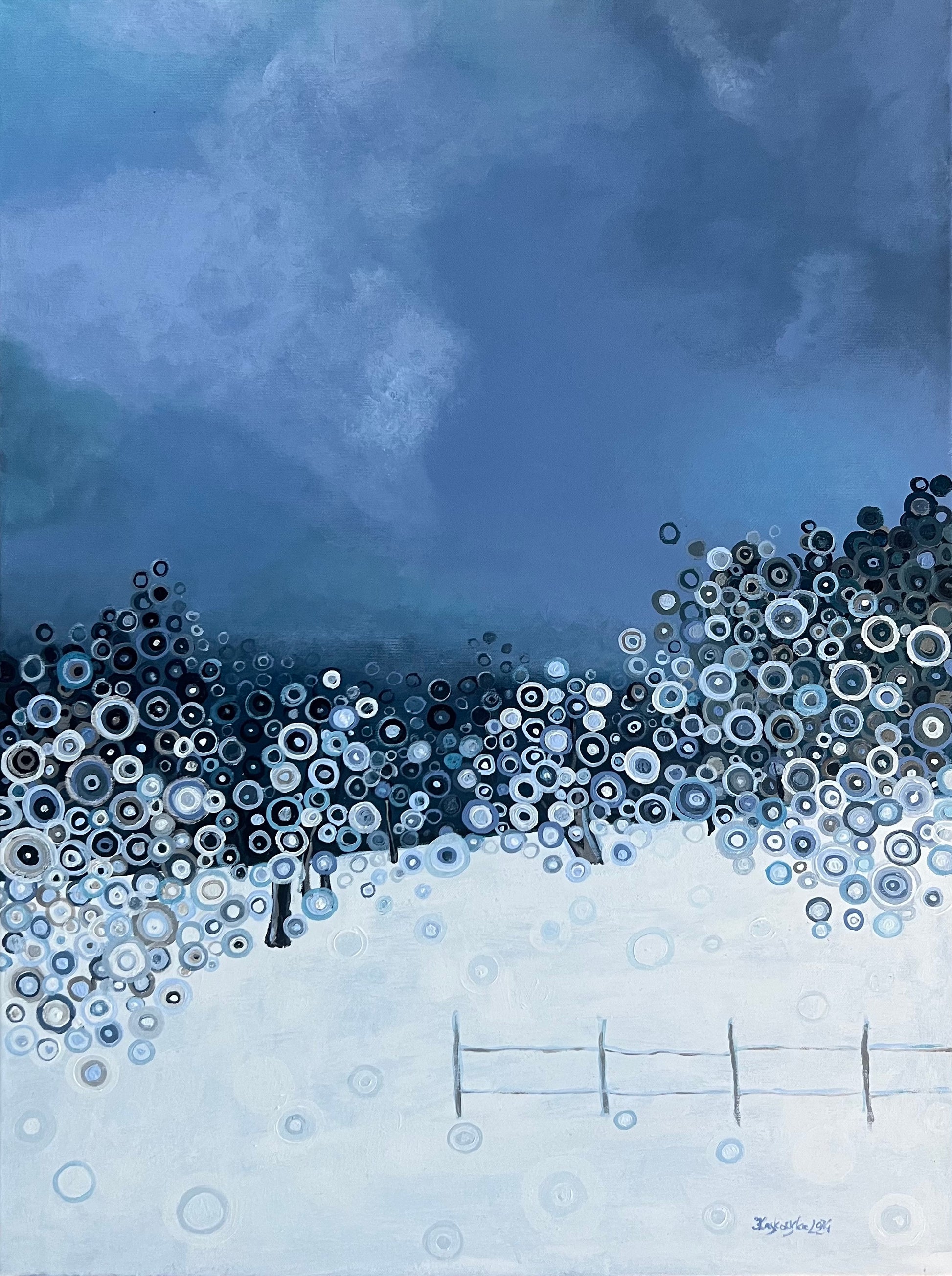 Baby, It's Cold Outside ist ein originelles zeitgenössisches Gemälde von Kasia Laskowska, inspiriert von der stillen Kraft und Gelassenheit winterlicher Landschaften.