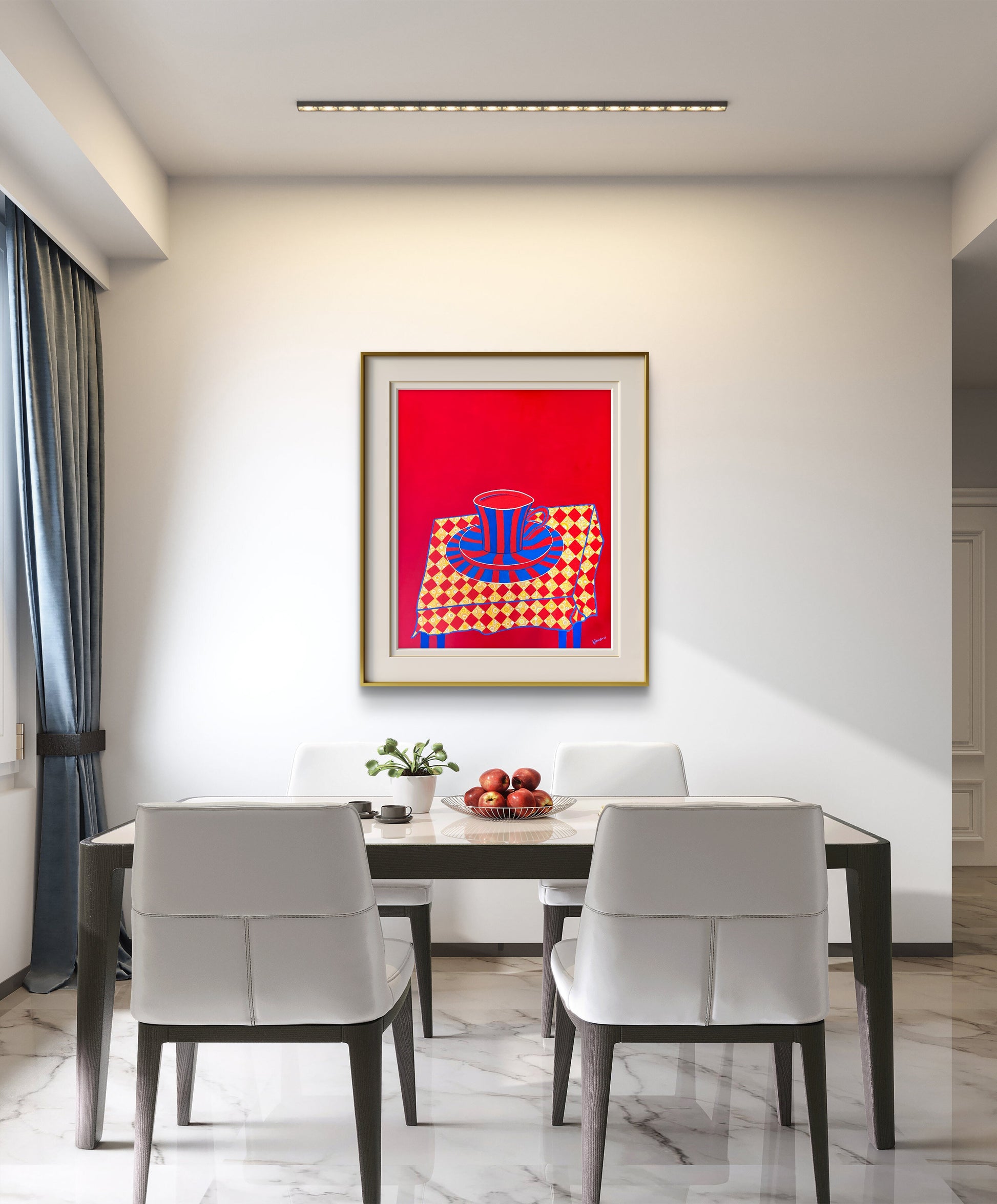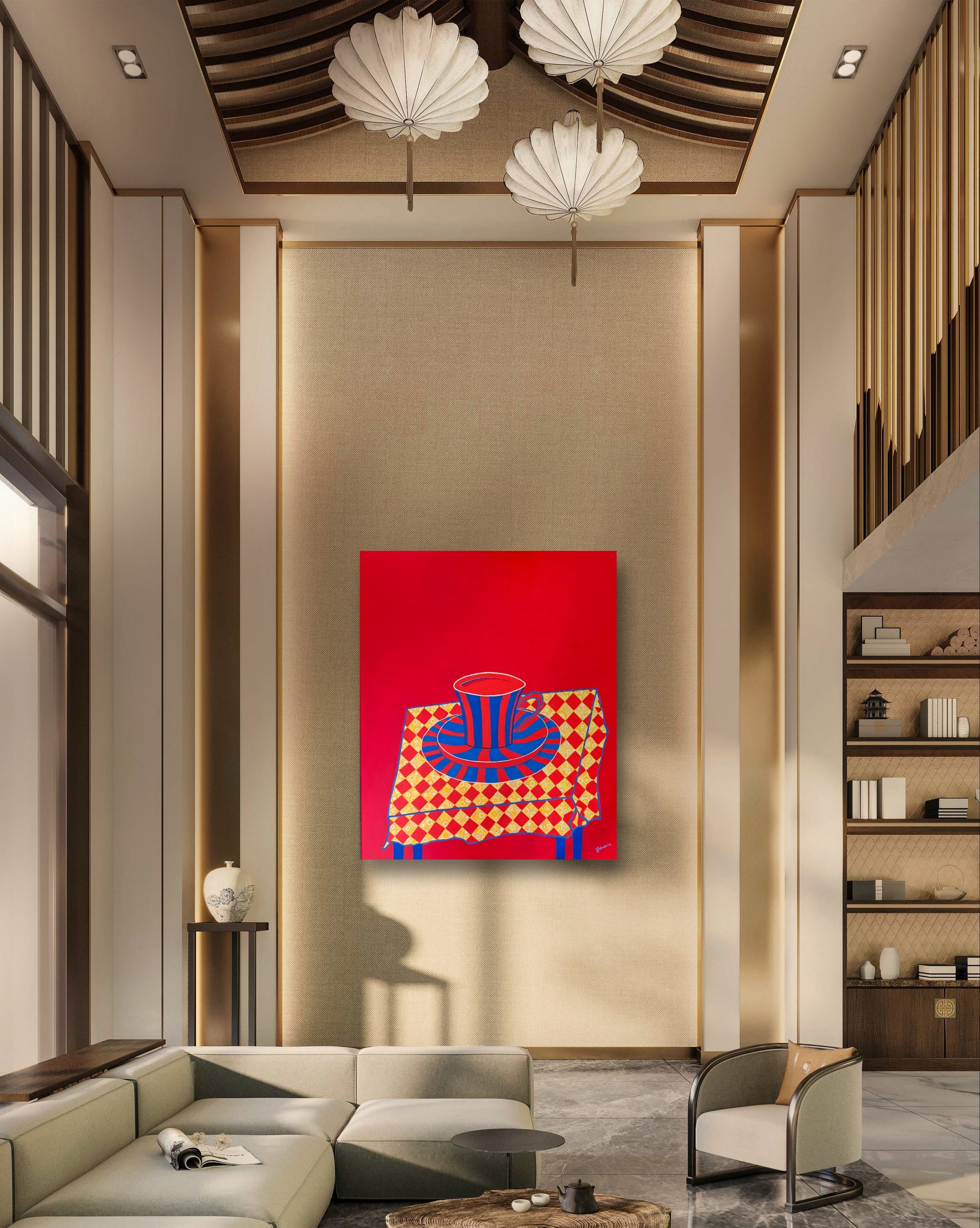 Dieses großformatige Acrylbild auf Leinen, entstanden 2022, markierte den Beginn des Triptychons „TEE TIME“ . Die Inspiration kam allein aus der Farbe – ich beschränkte die Palette auf nur drei Primärtöne: Blau, Rot und Gelb. Diese selbst auferlegte Einschränkung wurde zu einer kreativen Herausforderung und lenkte die Aufmerksamkeit weg von der Erzählung hin zu Form, Balance und Komposition.
